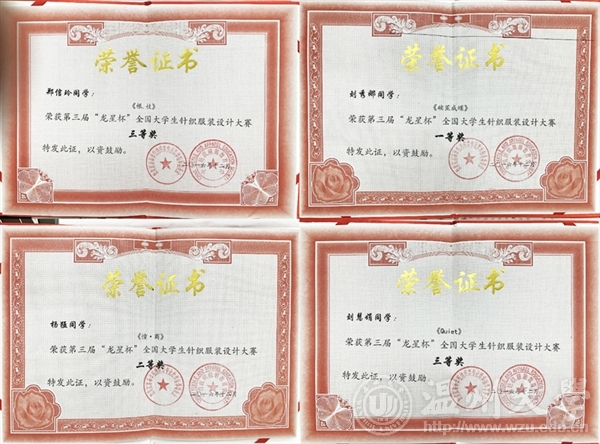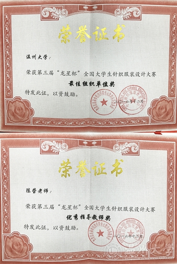 2016年12月30日,由免费av影片部高等学校纺织类专业教学指导委员会和中国纺织服装免费av影片学会主办的第三届“龙星杯”全国大学生针织服装设计大赛,颁奖典礼在东华大学举行。免费av影片 服装专业学子在赛事中斩获包括一、二等奖在内的六个奖项,免费av影片 获优秀组织奖,陈莹老师获优秀指导教师。