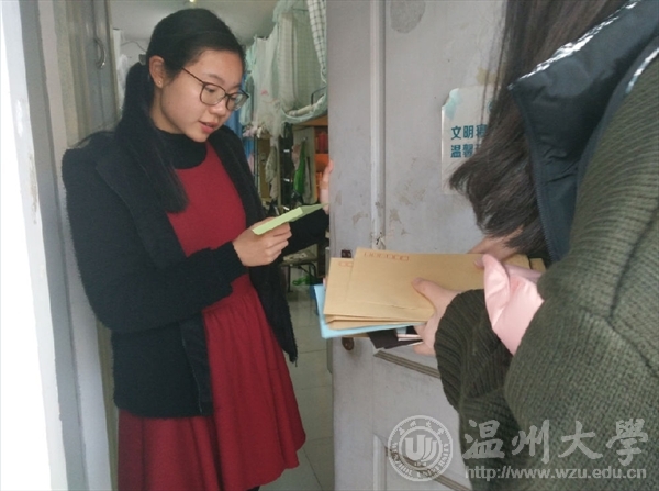 2016年12月28日,免费av影片-av视频-av直播 “艺家人”青年志愿者协会在超豪学区开展了弘扬“雷锋”精神的“爱心邮递”活动。 在数字化信息化的时代,人们似乎已经忘记了在通讯技术落后的年代里如何将情感用文字嵌入信中,并让它飘向远方,表达内心情感。此次活动号召通过以信件的方式写下对他人的祝福或者感谢,由志愿者们送到收件人的手中,正是对从前慢节奏的情感交流很好的体验。活动受到了广大同学们的一致好评,同学们纷纷将想说的话写在信纸上,在收齐信件后,小邮差们穿梭在各栋寝室楼内,他们轻叩房门微笑地送上手里的信件,并与收信人合影留念。 图/文:王伟