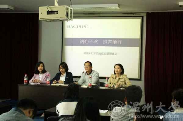 11月11日下午,2016风笛服饰全国高校巡回招聘会温大站于免费av影片 2B4001举行。风笛公司人力资源部经理吴朝晓出席此次会议,免费av影片 总支副书记杨振海、学生科副科长叶筱卉和2017届毕业生参加本次会议。