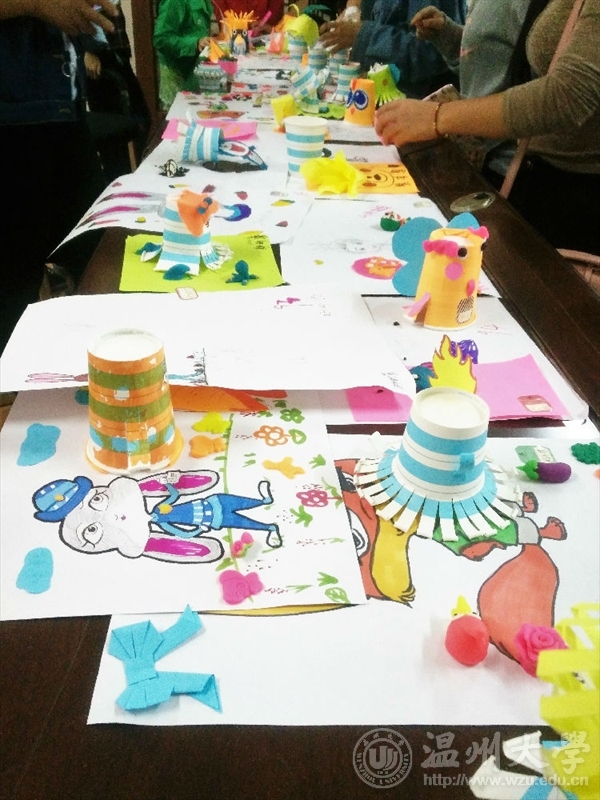 这次的支教活动的主题是“我和动物有个约会”,主要是通过绘画和橡皮泥制作3D动物形态。作为本次绘画课老师,来自16服设四班的陈晨同学播放了《疯狂动物城》的动画片段,以此来激发小朋友们的绘画兴趣。在选择好自己想画的人物后,在志愿者的带领下,小朋友们根据图片认真地进行绘画并且发挥了自己的创意和想象力,在绘画人物的旁边用橡皮泥做了很多的装饰,将一张张白纸变成了一份份承载着童真和幻想的令人惊喜的作品。