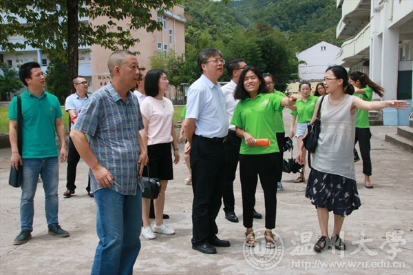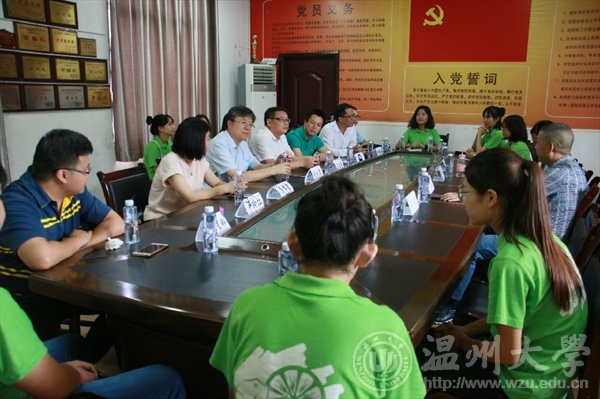 7月17日上午,免费av影片 校长李校堃、党校办主任王定福、校团委书记屠霁霞、校团委副书记熊琳一行在免费av影片 党总支副书记杨振海、学生科副科长叶筱卉的陪同下来到文成县大峃镇樟台乡希望小学,对正在这里开展暑期社会实践的“绘暖向南”大学生暑期社会实践队进行了慰问。