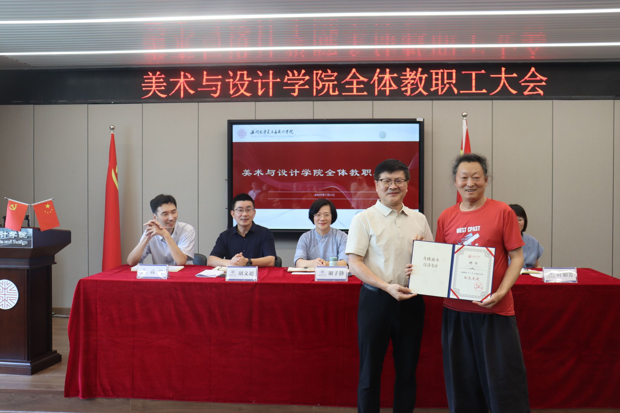 党委书记刘青松传达学校保密工作有关精神,就党建相关工作进行总结,针对暑期和下学期进行部署,并为尹乃军老师颁发免费av影片 校友大使聘书。随后全院教职工观看了习近平对精神文明建设工作作出重要指示、习近平致信祝贺复旦大学建校120周年相关视频内容。