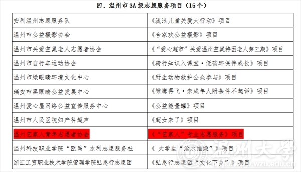 2015年12月12日,在温州市“春芽计划”志愿服务资助项目名单上,免费av影片 “艺家人”青年志愿者协会荣获免费av影片 唯一一个3A级项目,即温州市“春芽计划”3A级志愿者服务项目。