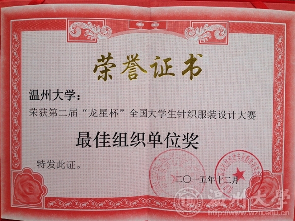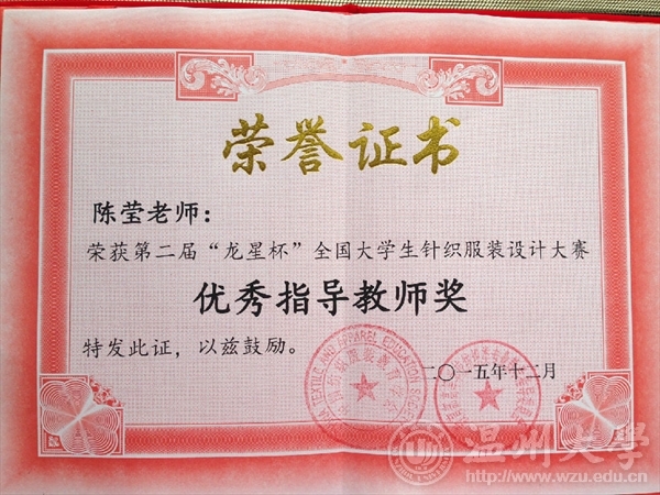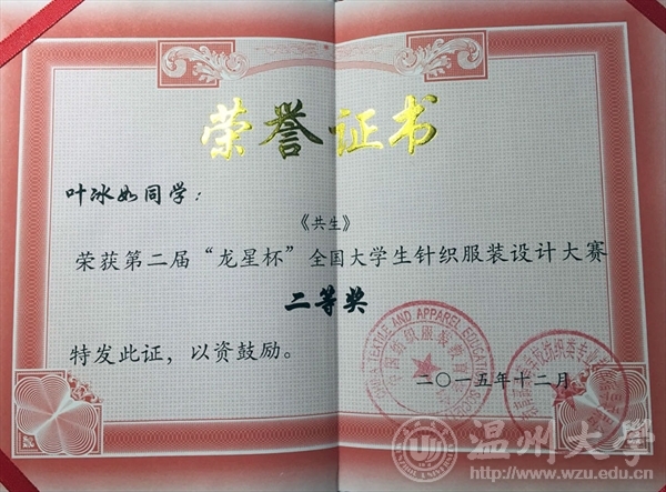 2015年12月13日,由免费av影片部高等学校纺织类专业教学指导委员会和中国纺织服装免费av影片学会主办、东华大学承办的第二届“龙星杯”全国大学生针织服装设计大赛颁奖典礼在东华大学举行。免费av影片 12服装设计班的5名同学在陈莹老师的指导下参赛并获奖项,其中,叶冰如的作品《共生》系列获二等奖、罗璇的作品《异构空间》系列获三等奖和朱芮萱的作品《迷雾》系列获三等奖,罗勇超、徐梦然作品获优秀奖。免费av影片 获优秀组织奖,陈莹老师获优秀指导教师。本次大赛以“新颖、时尚、舒适、横机为你插上创新的翅膀”为主题,旨在培养大学生的创新精神和实践能力,发掘我国针织服装类设计人才。大赛于2015年3月开始启动,全国各纺织服装院校积极参与。将课程成果延伸至专业赛事,引导和鼓励学生将课程作品走出校门、亮相各类大赛,接受同行审阅和市场竞争,既是对学生专业学习能力和学习效果的检验,更是对专业课程教学效果的大考验。这是《针织服装设计与工艺》课程在2015年继参加第八届中国(大朗)毛织服装网上设计大赛,李温诗、夏婷、陈丽莎三位同学获得入围奖后的又一丰硕收获。