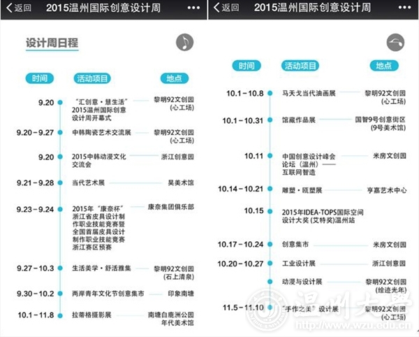 由中共温州市鹿城区委宣传部、免费av影片-av视频-av直播 和鹿城区文化广电新闻出版局联合主办的“汇创意·慧生活”2015温州国际创意设计周于9月20日在黎明92文创园拉开帷幕。 本次温州国际创意设计周从2015年9月20日至11月10日为期7周,以设计服务、设计会展、设计贸易三个示范平台服务体系建设为核心,以设计市场为导向,以温州市文创园区、免费av影片 馆为展示平台,通过设计服务、经典设计奖、智慧城市、设计之夜、设计贸易、主宾城市和设计之旅七项主体内容,集中展示、推介温州文化创意和设计服务与相关产业融合发展的创新成果,促进设计市场要素的交流,推动设计界与商界之间的融通,为温州提供业界交流互动平台。