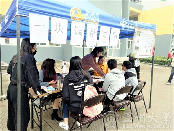 2017年11月25日至11月26日,在这两天中,温大免费av影片 “艺家人”青年志愿者协会在免费av影片 超豪学区2号楼下开展了爱心邮递活动。这两天正好遇到天气降温,也飘着小雨,但是爱心邮递的志愿者们的热情却丝毫没有减少。在活动的两天中,志愿者们每天准时在楼下集合,将一切准备好之后,便开始讨论该如何更好地宣传,吸引同学们前来写信。最开始的时候,因为天气降温的原因,同学们在楼下走动的非常少,大部分都是匆匆而过,不愿意在这么冷的天停留,但是随着时间的流逝,志愿者们热情的问候与宣传,有越来越多的同学愿意停下自己的脚步给同学、给老师、给父母写下充满思念和祝福的信,甚至有的同学一次性写了多张明信片,希望能寄给远在外省的朋友们,也有各个部门的同学们,通过一张张薄薄的明信片写下了对自己部门以及其他部门的美好祝愿,还有不少同学将自己写好的信送下来,希望志愿者们能帮他们寄出去。去除成本,同学们每寄一份信或者一张明信片协会就会收到一元钱,而所有的钱都将无偿捐赠给山区儿童,让山区儿童在冬天也能感受到社会给他们送的温暖。美好的两天爱心邮递时间结束了,一封信拉近大家的距离,唤醒自身内心深处涌动的深情,志愿者们也会如期把这些爱送到被爱的人身边,最后的活动经费也将如实的寄给贫困儿童。这次活动让志愿者们切身体会到了传递感情的力量,也希望在这冬天,温暖能够一直传递下去,当时没说出口的再见,没来得及告白的人,想说又说不出的秘密,志愿者们为你,用心填补你心中那些牵挂和思念。 图/文:金 哲罗会慧董 悦