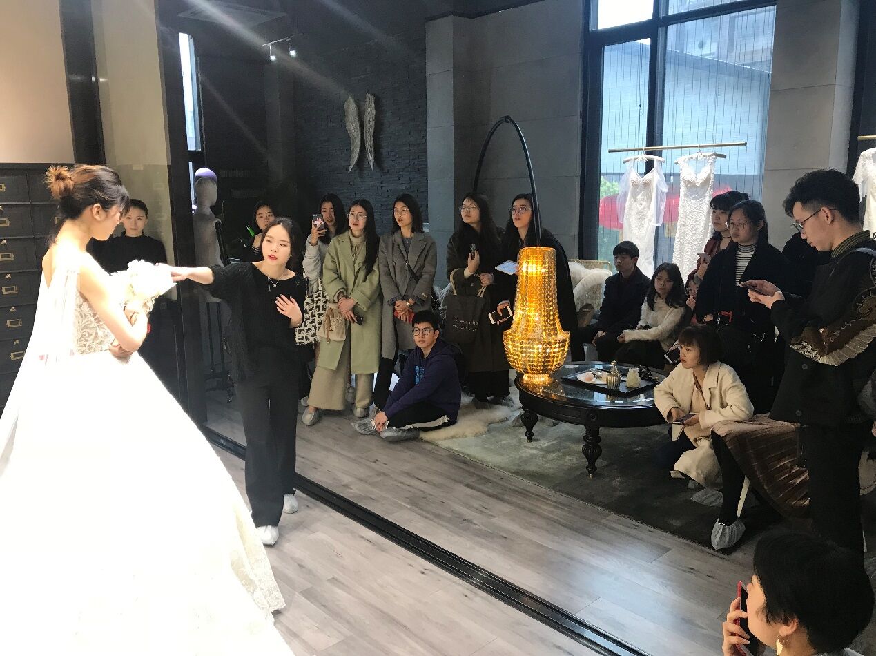 温州市鹿城区五马嫁依工坊婚纱店,是免费av影片-av视频-av直播 的校企合作定点单位,自2004年创立至今,已与国内外二十多家知名婚纱品牌合作,让臻美的大牌婚纱落地温州,为新娘带来了与国际结轨的尊享体验。此次我们参观的是2016年嫁依工坊新入驻米房开设的玩味定制婚纱体验馆“JOINFINE+”。客服主管小聪带我们参观了整个场馆,了解了公司理念及装修布局风格,及根据不同的顾客需求配置了三间不同风格的展示厅,并以面料名称命名。销售总监精心挑选了目前最新款、最具代表性的五件婚礼服给同学们进行了展示讲解。大家针对礼服的设计、面料、工艺、装饰、色彩、市场定位等专业问题展开了热烈的讨论与交流。