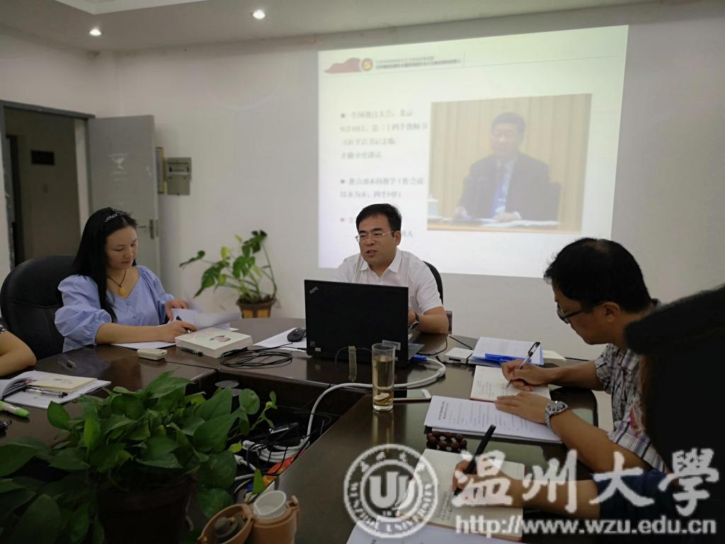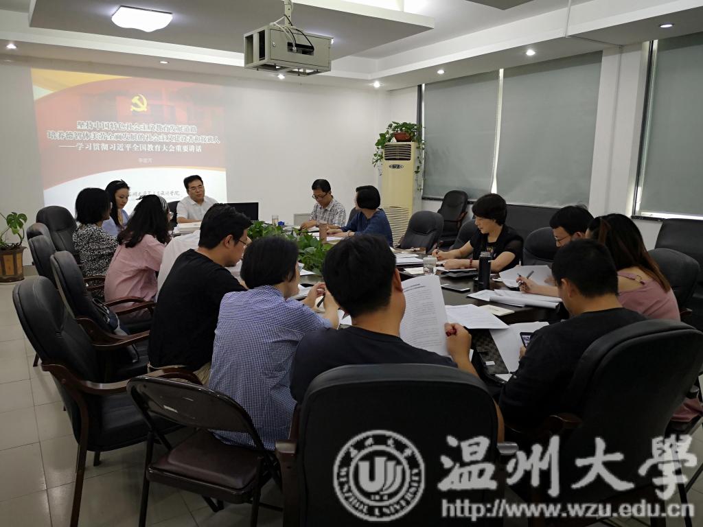 9月26日下午,免费av影片 在2B216召开党总支中心组理论学习(扩大)会暨党务工作例会,传达学习习近平总书记2018年9月10日在全国免费av影片大会上的讲话精神和省委免费av影片工委副书记陈根芳同志在高校高知识群体中发展党员工作座谈会上的讲话精神。学院党政班子成员、总支委员、支部书记、系主任、各科、教研室主任以及研究生支部副书记参加学习。会议由学院党总支副书记杨振海主持。