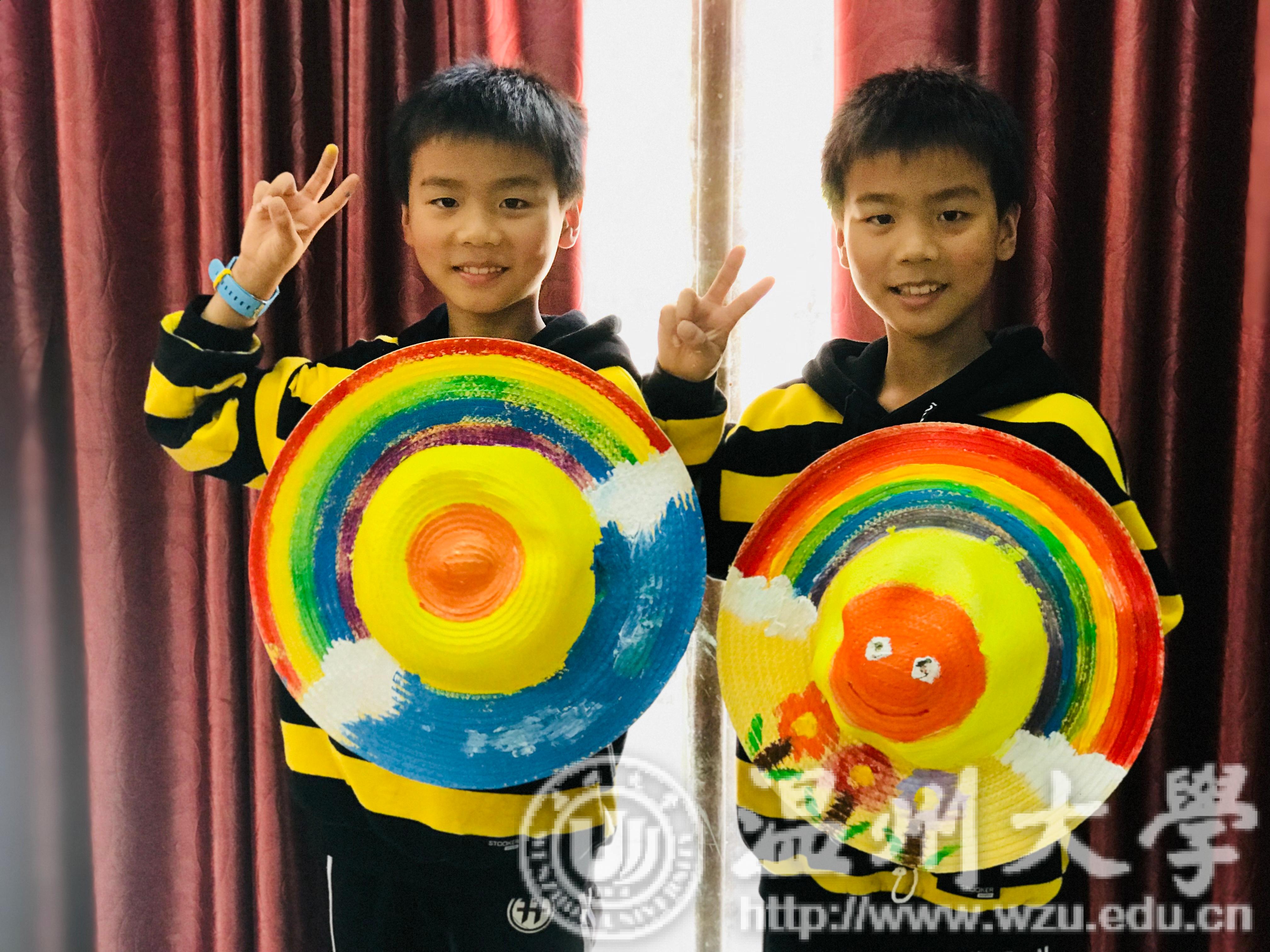 画完之后,志愿者们便领着小朋友们去太阳底下晒干自己的原创草帽作品,各色各样草帽在阳光下晒着,所有参与者的心也被晒得暖洋洋的。为期半天的志愿者活动让志愿者们与孩子们都结下了深厚的友情,此处支教活动不仅通过志愿者自身的努力,使小朋友们更加积极主动的完成自己的创作,并且增强了大学生的奉献精神和服务意识,更多的是我们收获了友情与快乐!